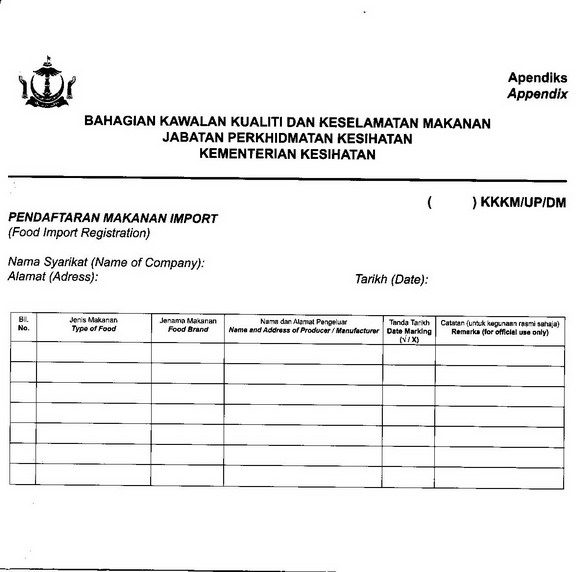 進口商需要向文萊衛生部衛生服務司的食品安全和質量控制處(The Food Safety and Quality Control Division, Department of Health Services, Ministry of Health)提出注冊申請,并填寫注冊表,提供以下信息:
