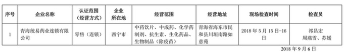 根據《中華人民共和國藥品管理法》及其實施條例規定,依照《藥品經營質量管理規范認證管理辦法》組織認證檢查,以下企業符合《藥品經營質量管理規范現場檢查指導原則》和《青海省藥品經營質量管理規范現場檢查細則》規定的內容,現予以公示公告,請社會各界監督。