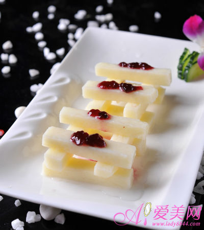 (1)山藥洗凈,放入鍋內,加清水淹沒山藥為度,用旺火煮。待山藥較爛時撈起,去皮,用刀剖成6厘米長、3厘米寬的長方形,拍扁。蜜棗一顆兩半去核待用。