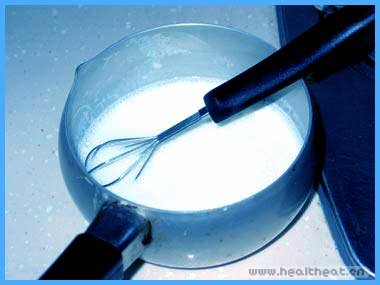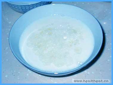 6、輕輕攪一攪蛋清就和牛奶融合在一起了,如果蛋清事先沒打過,那么怎么攪蛋清都是一塊塊的,不均勻(混合完畢后,把混合物倒入剛才底層有奶皮的碗中,一定要小心啊,不要把奶皮弄破)