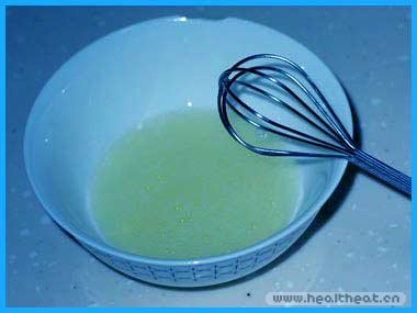2) 拿一個空的大碗中放入二只蛋清(蛋清蛋黃分離的方法想必大家都會的,就不多說了)、二勺糖,攪勻至糖溶解(不要打太久,否則變蛋泡了)