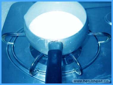 1) 先把牛奶倒到鍋中剛煮開即可(燒久了會破壞蛋白質,也結不起奶皮了),然后再倒入大碗,這時可以看到牛奶表面結起一層皺皺的奶皮。