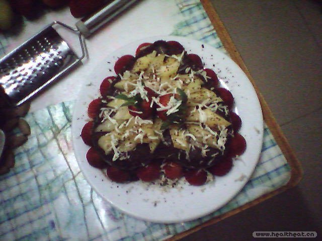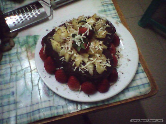 第八:蛋糕出來把它到出來放到碟子上,現在就可以把朱古力糊淋勻整個蛋糕,再根據自己喜歡擺上水果就可以了,剩下的芝士還可以刨成條狀放在蛋糕上