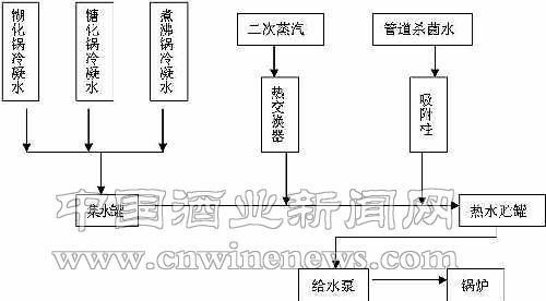 糊化鍋夾套蒸汽冷凝水、糖化鍋加熱帶蒸汽冷凝水、煮沸鍋加熱器蒸汽冷凝水,分別經(jīng)疏水器進入熱水集罐,利用余壓送往鍋爐熱水貯罐;煮沸鍋二次蒸汽經(jīng)列管熱交換器與一次軟化水進行熱交換,得80℃以上熱水送鍋爐熱水貯罐;發(fā)酵管道殺菌水經(jīng)活性炭吸附柱吸附過濾后,送鍋爐熱水貯罐;溫高80℃以上熱水,經(jīng)離心給水泵送鍋爐利用(如圖)。
