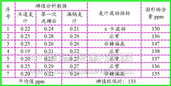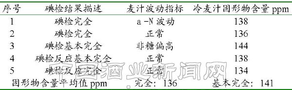 通過對5鍋麥汁的固形物含量與對應的糖化碘檢情況進行分析(見表3),發現人工因素較大。雖結果測定固形物有較大區別,但還不能認為其對固形物有明顯影響。