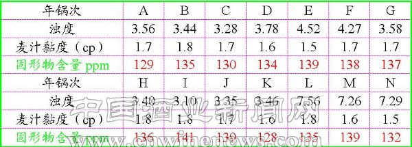 單從麥芽的變更情況看,雖然糖化麥汁部分指標有所波動,但麥汁固形物含量沒有明顯的改變。實驗中固形物的含量雖有微小的差別,但成品酒指標比較穩定。