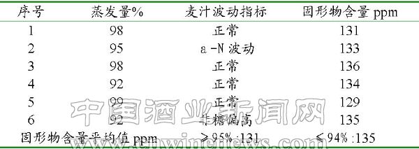 本實驗由于跟蹤煮沸過程比較難,只能從蒸汽的強弱(即蒸發量)來判斷。由于是自動化操作運行,時間也基本是固定的。對6鍋麥汁在大蒸發過程的跟蹤情況以及對應的固形物的含量見表6。
