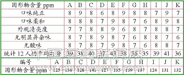 從表7不難看出,影響分數的主要因素是酸味。隨著固形物含量的不同,酸味的影響也不同,并且固形物含量高者,酸味相對偏高。固形物含量的高低,對其它品酒指標沒有太大的影響。因此,可將固形物含量控制在136ppm以下。