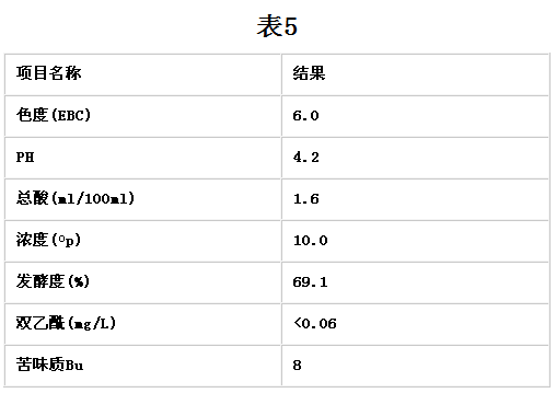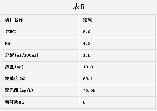⑤使用小麥麥芽代替部分進口麥芽和使用玉米糖漿代替大米,生產出的麥汁在理化指標上并沒有太大差別,能達到企業內控標準。