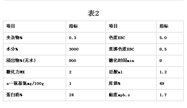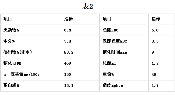 本實驗使用的小麥芽是以冬小麥為原料,經過適宜的浸泡、發芽、干燥等過程而制得。這種麥芽色澤穩定、溶解性好,有很高的糖化酶、蛋白酶活性及豐富的α、β—淀粉酶(理化指標見表2)。