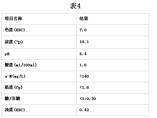 麥汁定型后加糖漿,糖漿用泵泵入,糖漿一定要保溫貯存,以降低糖漿粘度,便于添加。麥汁理化指標平均值見(表4)。