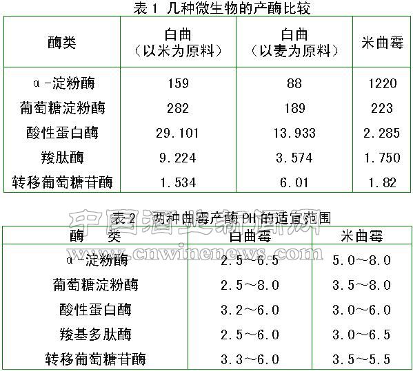 白曲的另一重要特性是它具有較好的耐酸性。白曲霉、米曲霉產酶的pH適宜范圍見表2。