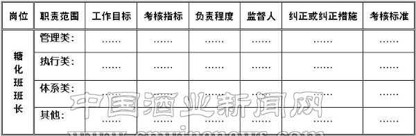根據崗位職責對每個崗位操作人員職責權限及工作內容進一步橫向細化,并規定出員工職責的負責程度、工作目標、考核指標、糾正或糾正措施、監督負責人等內容,即每天的工作內容及需要掌握的各項規定和考核要求,可以和個人績效結合起來,做到有責任、有目標、有考核(以糖化車間糖化班班長為例見表1)。