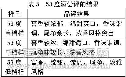 此外,選取不同的龍泉春基酒和調(diào)味酒,勾兌若干小樣,反復(fù)品嘗分析,最后確定53度高、中、低檔和39度高、中、低檔6個(gè)酒樣(表4、表5、表6、表7)。