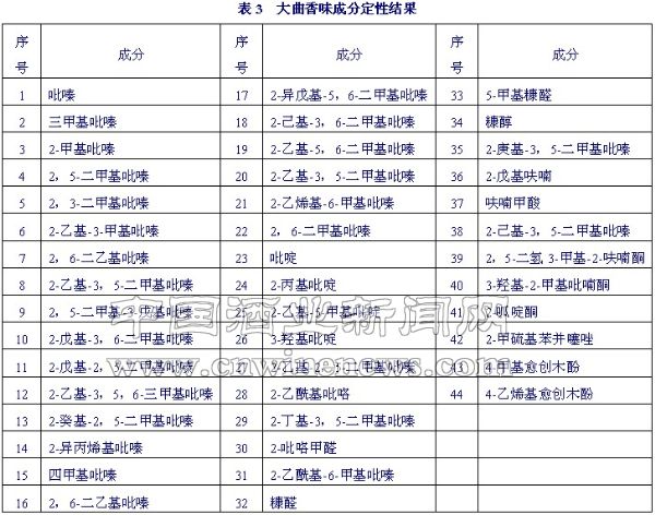 大曲中微量成分種類的多少及含量的高低,在白酒中發揮了相當重要的作用。它影響著中國白酒的質量和風格。趙東等人采用頂空固相萃取氣質聯用法測定大曲中的香味成分,發現大曲中的香味成分有吡嗪類、吡啶類、吡咯類、呋喃類、吡喃類、噻唑類高級脂肪酸類,達數十種之多(表3)。它們必然融入酒體而影響酒的質量與風格。