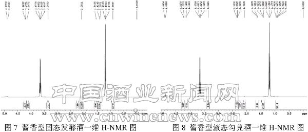 通過對三種香型的固態發酵酒與液態勾兌酒做一維H-NMR,進一步說明這些化學組成相同,但制酒工藝不同得到的酒在微觀構成上存在著差異性。