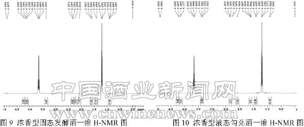 (1)圖7、圖8分別為醬香型固態發酵酒與液態勾兌酒,由于對水峰進行了壓制,在譜圖中我們看到的是,甲基CH3—和亞甲基CH2—峰(從右往左),所以從整體上看,兩個酒樣的峰型結構基本相似。但通過對比分析,我們可以發現,雖然基本峰形相似,但各譜圖中出現的弱峰數不同。固態發酵酒在甲基的3個標準的強峰外,有4個弱峰,而液態勾兌酒有10個弱峰。固態發酵酒在亞甲基的4個標準的強峰外,有4個弱峰,而液態勾兌酒有5個弱峰。即液態勾兌酒的弱峰數要大于固態發酵酒的弱峰數。原因分析:在兩種酒體化學構成基本一致的情況下,其一維H-NMR圖出現不同,說明兩種酒體在微觀構成上存在著區別。