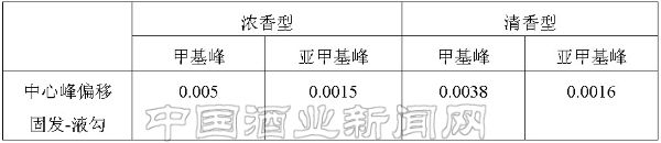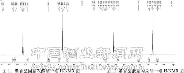 (2)從核磁圖中我們還可以看到,濃香型的圖9與圖10,清香型的圖11與圖12,其甲基與亞甲基的中心峰位移固態發酵酒比液態勾兌酒均向左偏移(表1)。