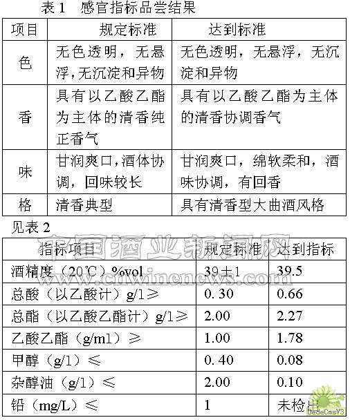 通過感官品嘗和氣相色譜分析相結合的方式,經過上百次的小樣勾調試驗,篩選出了既能突出清香風格,又照顧后味,酒體協調,并能基本解決各種質量缺陷的勾兌工藝,所勾兌出的樣品經組織專業評酒委員品嘗后一致認為,質量達到了預定的要求(見表1、表2)。