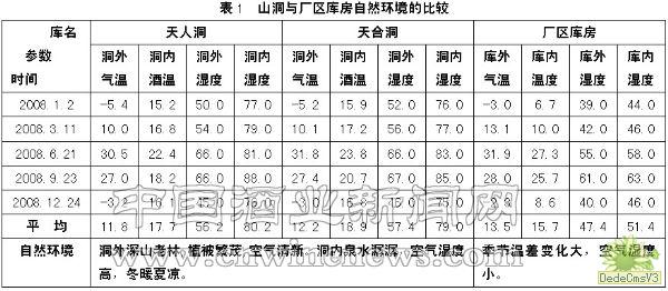 由表1看出,天人洞和天合洞的洞內酒溫基本上穩定在16℃—23℃之間,而廠區庫房內酒溫在7℃—27℃之間,溫差變化大;洞內濕度高,為75%—88%,這是受洞內泉水影響所致,而庫房內濕度均在44%—63%之間,濕度較小。經我們跟蹤測量,在晴天有風的春天,庫房內濕度最低達到25%,而山洞內看似干燥的春天,洞內濕度也達到了75%以上。