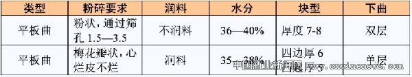 北方酒廠生產包包曲多為:曲香純正、氣味濃郁、斷面整齊、機構基本一致,皮薄心厚、呈豬油白色,間有淺黃色,少量的黑色、異色。在粉碎、潤料要求、水分、塊型、下曲層數等方面的技術要求上,和平板中高溫曲有所不同的具體情況如表一。