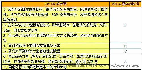 CPCPR是實現持續改進的一種有效形式,其為SOP執行過程中,潛在的可以改進和創新的內容,提供了一種標準化的解決思路。思路的主體思想包含在PDCA循環的計劃、執行、研究和行動中。(見表1、圖2)