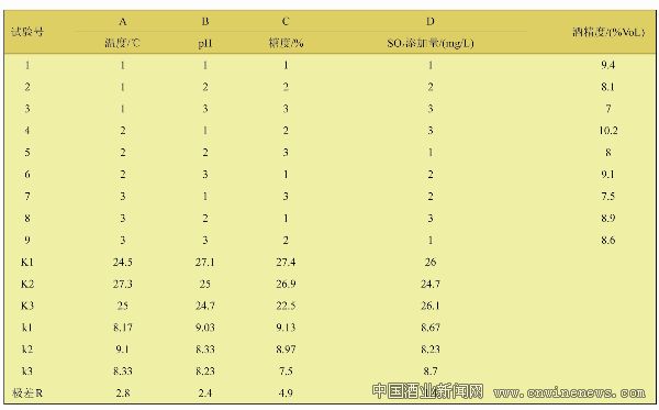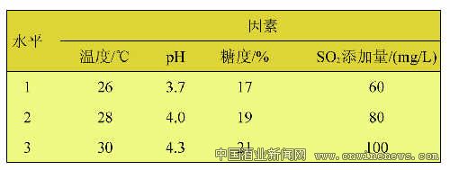 發酵溫度、pH、糖度(%)和SO2的添加量(mg/L)4因素正交試驗結果見表2。