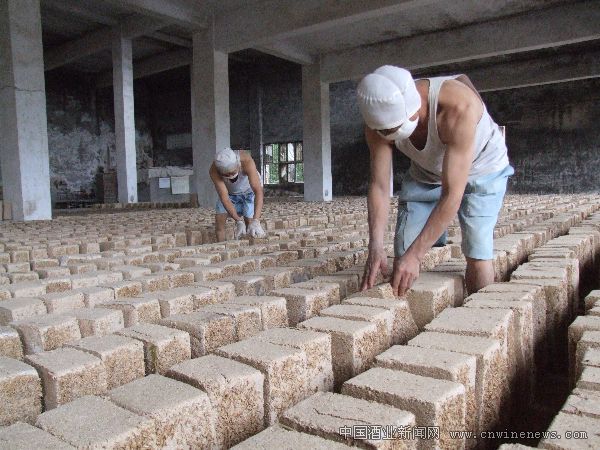 曲坯的原料松緊程度是制曲過程中重要的一環(huán)。實(shí)踐證明:曲坯不能壓的過緊,否則會(huì)造成菌絲不易向曲心內(nèi)部生長,水分也不易向外排出,成曲后顏色不正,曲心長不透有異味,易造成生心和后期窩水。過松易散、不易成型、不便于臥曲操作,又不利于保溫、保濕,同時(shí),可引起曲坯升溫過猛、水分散失過快、曲內(nèi)部不穿衣等嚴(yán)重質(zhì)量問題。所以,機(jī)制曲時(shí),應(yīng)反復(fù)摸索,控制制曲成型機(jī)的壓力,達(dá)到最佳的結(jié)合點(diǎn),不宜過緊,也不宜疏松,按之有揉面感,較為合適。
