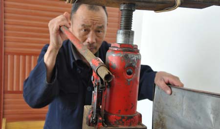 村民們介紹,毛樹倫是赤岸一位專業的榨酒師傅,這臺用千斤頂做成的榨酒工具正是毛樹倫自己發明的,每年從農歷十月開始,都會推著榨酒具到深塘、南楊村等挨家挨戶地上門去榨酒。