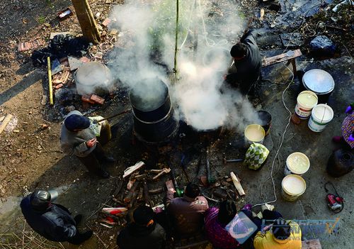 12月26日,虹星橋鎮(zhèn)白水村村民祁有意正在釀酒師傅鄭能安的幫助下釀造農(nóng)家米燒酒。還沒有進(jìn)院子,一陣陣酒香便撲鼻而來。在院子一角,農(nóng)家灶頭燒得正旺,一群人正圍著灶頭忙個不停。“這幾天天氣干燥,陽光充足,是架鍋燒酒的好天氣,早上6點(diǎn)多鐘我就開始生火了。”鄭能安一邊忙著手里的活,一邊和記者攀談起來。