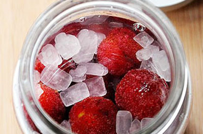 1.楊梅摘去梗、葉子,沖洗兩遍后,用淡鹽水浸泡20-30分鐘,再用涼開水過一遍。