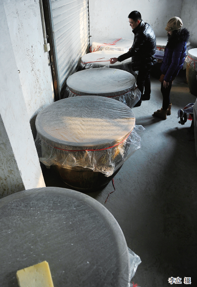 如今胡曉敏在自己的印刷廠里特設有一間酒房,一年里必釀兩次酒,只是這些酒成了他家親朋過年指定要的“年貨”。胡曉敏釀“人家燒”還是嚴格按照當年的流程,從泡黃衣粬開始全程手工。“糯米和水的配比有規定,單是發酵就需四個月,只有這樣釀出的‘人家燒’喝了之后才不口渴不頭疼”,胡曉敏說著打開了一缸2013年農歷十月八日釀下的酒,黃衣粬和糯米浮于水面厚厚一層,記者用手輕輕一撥,飽含谷物的芳香撲鼻而來,入口一嘗酒味還不濃烈但清氣逼人。“四個月后,黃衣粬(一種菌)基本已經不見,而它就是酒里引發頭疼的根源”。