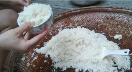 三、洗米飯。蒸糯米飯時,可以一邊燒一鍋開水,燒開之后涼冷。糯米飯蒸熟之后,要用事先準備好的干凈的簸箕攤開涼冷。等糯米飯涼了后,就可以用涼開水將飯輕輕洗一遍。通常,蒸熟的飯比較干,用水洗的時候,飯會一粒粒散開。