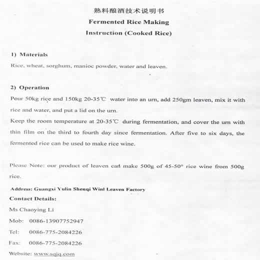 首頁糖酒科技釀酒科技 釀酒科技 熟料釀酒技術說明書 糖酒網 2016-05-17 18:01 釀酒科技 一、 原料:大米、玉米、小麥、高梁 二、 配料:以100斤大米為例,酒曲5兩 三、 操作方法:把煮熟的酒飯攤 一、 原料:大米、玉米、小麥、高梁 二、 配料:以100斤大米為例,酒曲5兩 三、 操作方法:把煮熟的酒飯攤涼后鏟入大水缸里按米的飯和水即1:3斤水倒大水缸中后攪拌均勻時水溫在20—35度可加入5兩酒曲攪拌后加蓋。整個發酵期室溫在20—35度,冬天保溫、發酵期不需蓋得太嚴,待發醞到3—4天時用泊膜封死5—6天可蒸酒。 上一篇Daufim原漿啤酒鮮釀機即將上市據全球頂級管理咨詢公司麥肯錫的預測,到2025年物聯網對經濟的影響力可以達到14.4萬億美元,物聯網與智能 上一篇雙匯董事長萬隆:“戰斗”還未結束年過七旬的萬隆倔強一生,與體制博弈,與資本過招,與行業陋習較量,甚至與自己的年齡賽跑,他總是最后的 相關文章 白葡萄酒的發酵過程 地缸為何能釀出“最干凈的酒” 啤酒機械對于發酵溫度的要求 香檳酒的制作工藝與特點 白酒自釀常識 紹興黃酒的做法 米酒的制作方法 啤酒生產工藝流程 香檳的釀造工藝 脫醇葡萄酒是真正的發酵酒