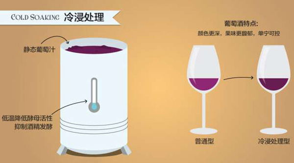 發(fā)酵時(shí)機(jī)的掌握也就是指冷浸處理(Cold soaking)和浸皮時(shí)間(Skin Contact)的控制,兩個(gè)概念都指的是葡萄皮與葡萄汁接觸的時(shí)長(zhǎng)。通過將葡萄汁保持在低溫的環(huán)境下,抑制了葡萄汁中酵母被抑制了活性而阻止發(fā)酵過程,目的就是為了提取葡萄皮中的色素和果味,而與此同時(shí),又可避免了萃取到苦澀的單寧。而在葡萄酒發(fā)酵中,我們將葡萄皮與葡萄酒接觸的整個(gè)過程稱之為浸皮(Skin Contact)。