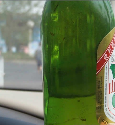 “山城啤酒”瓶內的雜質、死蟲子等(黑點)清晰可見