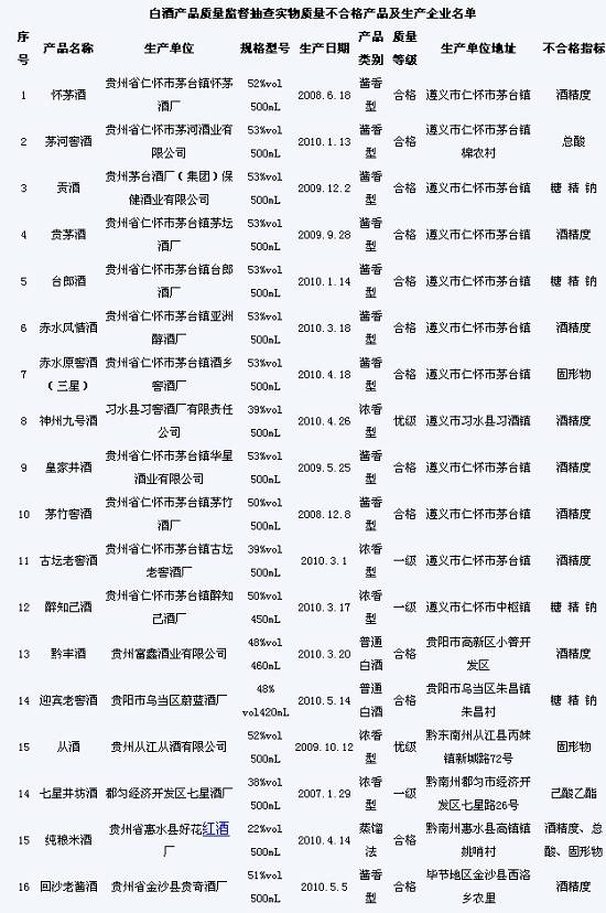根據公告,有16批次白酒不合格,其中貴州茅臺酒廠(集團)保健酒業有限公司的貢酒(53%vol500mL2009.12.2醬香型)、貴州省仁懷市茅臺鎮臺郎酒廠的臺郎酒(53%vol500mL2010.1.14醬香型)、貴州省仁懷市茅臺鎮醉知己酒廠的醉知己酒(50%vol450mL2010.3.17濃香型)、貴陽市烏當區蔚藍酒廠的迎賓老窖酒(48%vol420mL2010.5.14普通白酒)檢出糖精鈉。