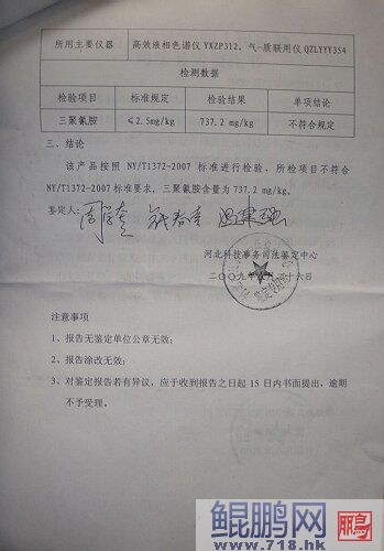 河北科技事務(wù)司法鑒定中心對石家莊華牧飼料的鑒定結(jié)果為:三聚氰胺超標(biāo)近300倍 三聚氰胺事件發(fā)生后,在全