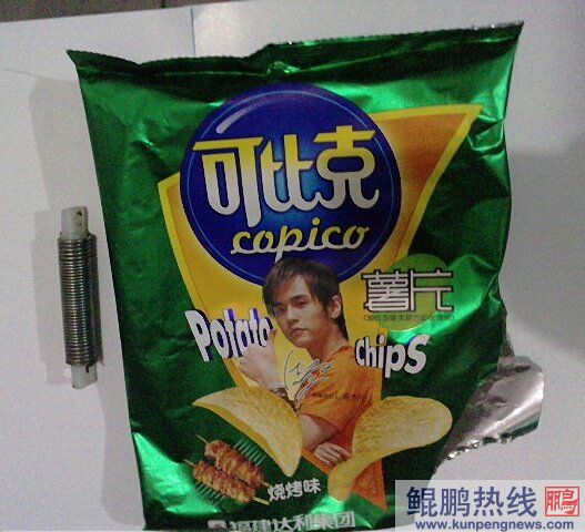8月9日,漢中市民袁玉波在市區一家便利店花3.5元買了一袋福建達利食品有限公司生產的60克包裝的可比克薯片(出廠編號20100324B15)。拆開包裝就吃起來。可是,吃著吃著,突然發現袋子里有一根手指頭粗的塑料零件,上邊套有一截亮錚錚的金屬彈簧。袁先生下了一跳,慶幸自己沒有稀里糊涂吃下去。