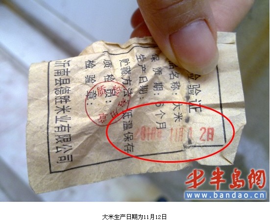 12月20日,記者在四方區小村莊見到劉女士,從她提出來的米袋中,可以很明顯的看出這些大米的差別,與普通大米相比,這些大米顏色上稍顯發黃、發綠,有明顯的霉味。熱水一沖后,淘米的水很快就被染成有些黃綠色。從米袋上,記者發現,這袋大米的生產日期是2010年11月12日,20℃以下可以貯存6個月。