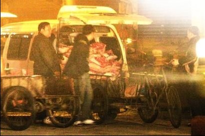 下午4時許,一輛藍色貨車拖著10多頭小豬開到平房前,將車尾對著瓦房大門。幾名男子迅速將豬拖進房內,緊接著就傳來一陣豬的嚎叫聲。附近一名居民告訴記者:臨近春節,這伙人的生意好得不得了,連白天都敢宰殺生豬。等到天黑,就會有肉販排起隊來買肉。