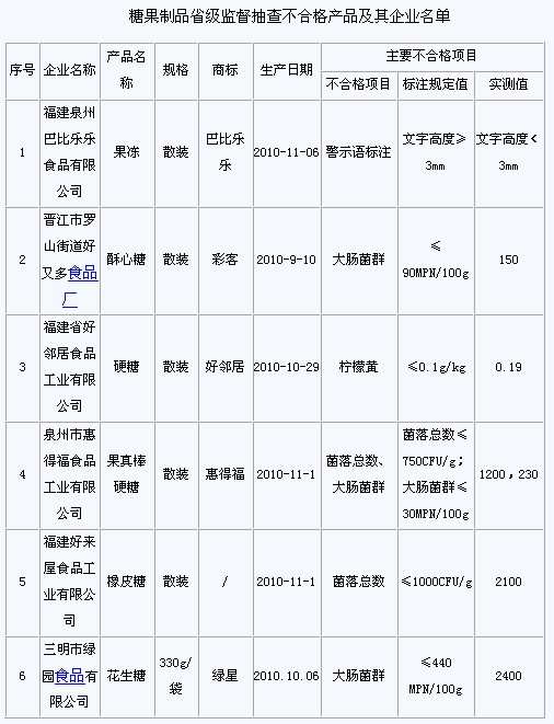 福建省質(zhì)量技術(shù)監(jiān)督局近日通報2010年第四季度福建省糖果制品監(jiān)督抽查結(jié)果,“彩客”酥心糖、“惠得福”果真棒硬糖、“綠星”花生糖被檢出大腸菌群含量超標。
