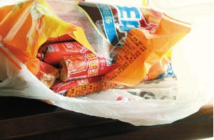 陳先生向記者出示他所買(mǎi)的已經(jīng)散發(fā)臭味的火腿腸。