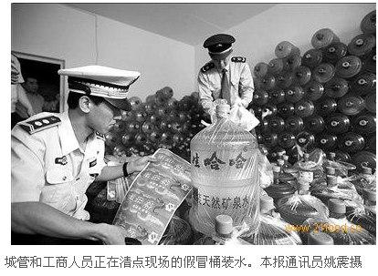 當天,城管、工商、公安、質監等部門聯合對衙門口村的違建進行調查,進入一個院子時發現竟是一處假桶裝水黑窩點。院內一間約有40平方米的屋子里,擺滿了一桶桶貼著“娃哈哈”等知名品牌商標的桶裝水,地上放著商標和防偽標簽。兩名工人正在向空桶內注水,而水管另一端直接接在院外的自來水水管上。黑窩點滿地污水,環境臟亂。工人承認,他們每天灌裝大約100桶假冒飲用水,貼上自制的假商標,以每桶三四元的價格銷售給非正規桶裝水批發店。僅5月以來,這里就已賣出近1000桶假冒桶裝水。制假者稱,這些空桶都是從市場上收購來的,沒有采取任何清洗、消毒措施。