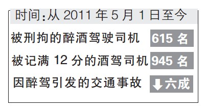 據(jù)鄭州交巡警支隊(duì)通報(bào),從2011年5月1日醉駕入刑以來(lái),鄭州交巡警持續(xù)加大對(duì)酒后和醉酒駕駛交通違法行為的查處力度,因醉酒駕駛引發(fā)的交通事故較醉駕入刑前減少了約六成。