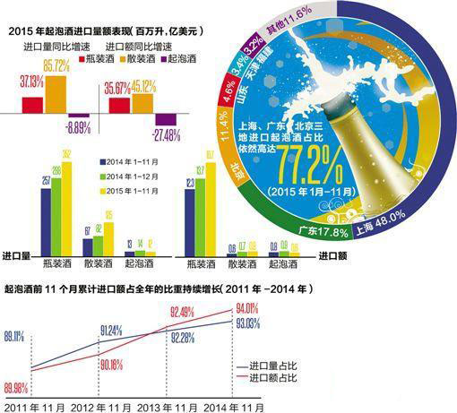 最新數據顯示,2015年的中國進口葡萄酒市場,整體表現突出,當年前三季度進口量就已超過上年全年,同比增長超40%;分品種來看,當年的市場主要增長動力來自于瓶裝酒和散裝酒,而起泡酒卻拖了后腿,前11個月累計進口量額同比分別下滑8.9%和27.5%。