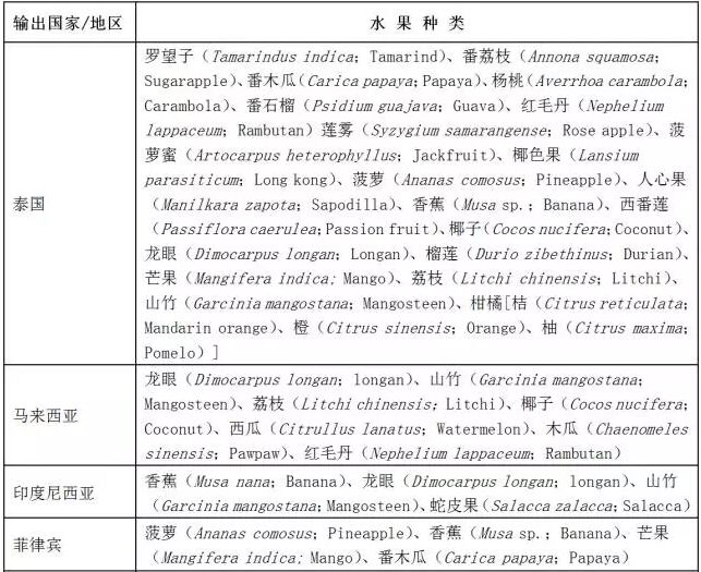 5月24日,質檢總局發布了《獲得我國檢驗檢疫準入的新鮮水果種類及輸出國家地區名錄》(2017年5月11日更新),涉及泰國、馬來西亞、印度尼西亞等43個國家和地區。詳細情況見下表。