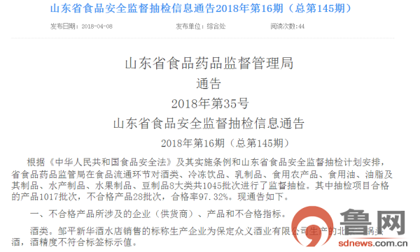 魯網(wǎng)4月9日訊(記者 張銘芳)記者從山東省食品藥品監(jiān)督管理局官網(wǎng)了解到,山東近日對酒類、冷凍飲品、乳制品、食用農(nóng)產(chǎn)品、食用油、油脂及其制品、水產(chǎn)制品、水果制品、豆制品8大類共1045批次食品進行監(jiān)督抽檢,其中抽檢項目合格的產(chǎn)品1017批次,不合格產(chǎn)品28批次,合格率97.32%。