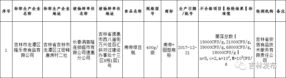 長春滿客隆連鎖超市有限公司德惠分公司銷售的標稱吉林市龍潭區隆樂奇食品有限公司生產的南帝綠豆糕,菌落總數檢出值為19000CFU/g、21000CFU/g、39000CFU/g、68000CFU/g、18000CFU/g,標準規定為標準規定為5次檢測結果均不超過105CFU/g,且至少3次檢測結果不超過104CFU/g。檢驗機構為吉林省安信食品技術服務有限責任公司。