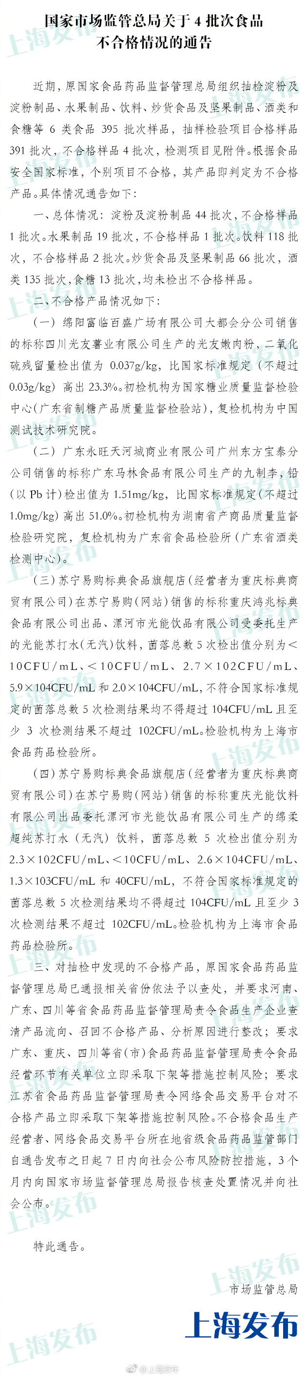 國(guó)家食品藥品監(jiān)督管理總局組織抽檢淀粉及淀粉制品、水果制品、飲料、炒貨食品及堅(jiān)果制品、酒類和食糖等6類食品395批次樣品。其中,蘇寧易購(gòu)標(biāo)典食品旗艦店(經(jīng)營(yíng)者為重慶標(biāo)典商貿(mào)有限公司)標(biāo)稱重慶鴻兆標(biāo)典食品有限公司出品、漯河市光能飲品有限公司受委托生產(chǎn)的光能蘇打水(無汽)飲料等4批次不合格。不合格項(xiàng)目為菌落總數(shù)超標(biāo)等。詳見↓